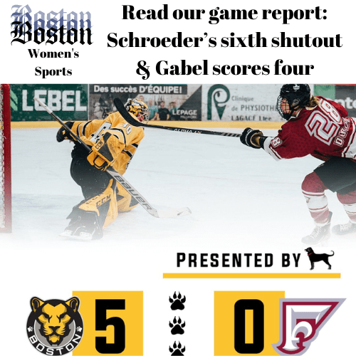 Credit the front office of the Boston Pride for advance planning: there is depth to this team. On a night when the defense was slim, with only four defensive players dressed for the game, the Boston Pride still won big, defended well, and goalkeeper Corrine Schroeder maintained a shutout, deflecting 50 shots. Schroeder’s fifth shutout last weekend broke the Premier Hockey Federation single season record, and like much of Boston’s winning ways this season, they just kept rolling on.