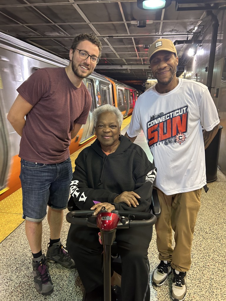 Roxbury residents Jason Smith and his mother Mama Smith took the MBTA Orange Line to North Station for the game. Both serve at the Ron Burton Training Village in Hubberston, MA (yes, of the same Steve Burton, and Veronica Burton family). Both are longtime WNBA and Connecticut Sun fans, but rarely travel to Connecticut, in part because of the lack of public transportation. “This is our car,” Mama Smith said, gesturing to the MBTA train. Mama Smith played in the 1960’s when you were only able to dribble three times before being required to pass.